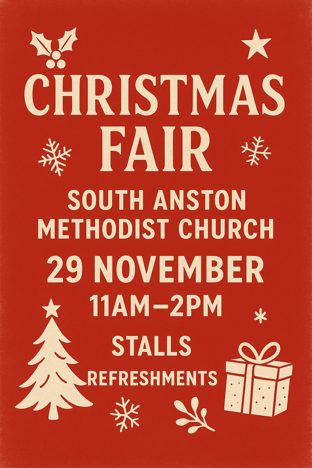 Join us for our annual Christmas Fair. There will be lots of stalls selling handbags, scarves, kintted toys, art, framed pictures, painted glass, cakes, books and bric a brac. There will also be a tombola and a raffle, with refreshments served throughout the day. Everyone is welcome.